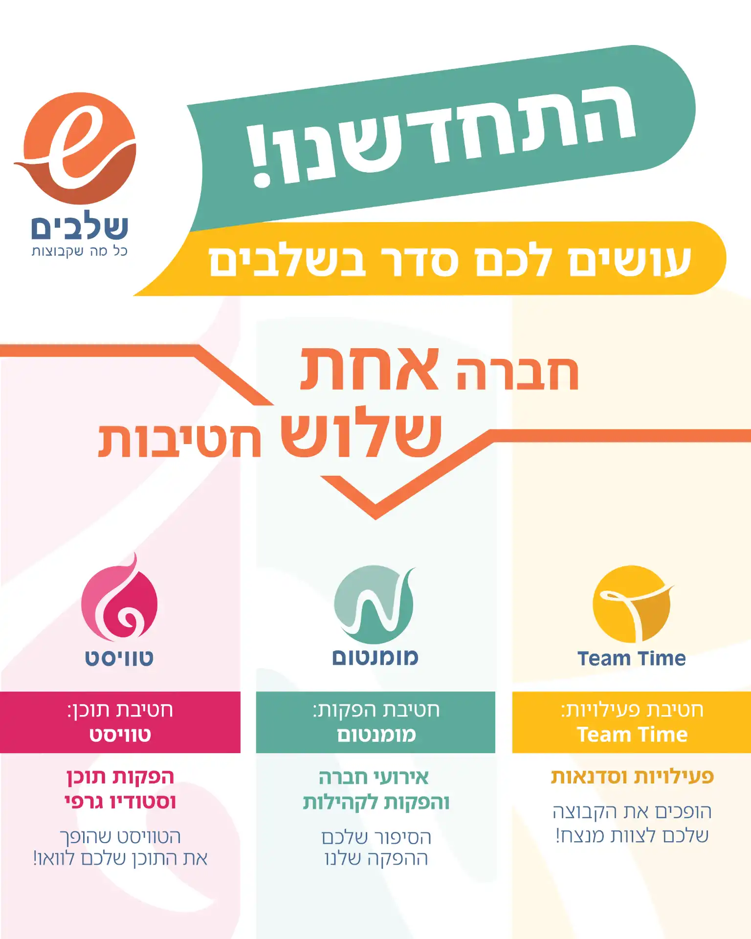 פעילויות דינמיות, אנרגטיות עם תוכן יצירתי ומקורי.אנחנו עובדים עם חברות עסקיות, עמותות, בתי ספר ואפילו גנים. הפעילויות שלנו מתמקדות בתקשורת בקבוצה ובעבודת צוות. יש לנו גם מגוון רחב של סדנאות בתחומים רבים שהולכים ומתפתחים כל הזמן.